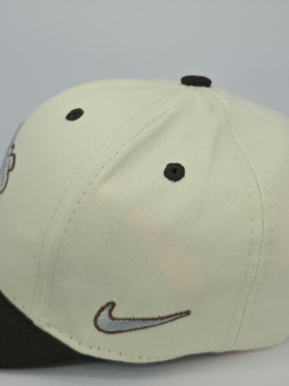 - Parche Lateral: Logo Nike Gris con borde café.